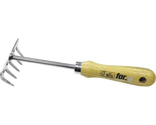Met de for_q hark van licht, robuust, weerbestendig roestvrij staal met ergonomische houten greep kun je ideaal kleinere tuinwerkzaamheden verrichten zoals onkruid of loof bij elkaar harken. Het essenhout van de greep is FSC-gecertificeerd. Het is dus afkomstig van duurzame bosbouw. Het solide tuingereedschap met 5 tanden weegt slechts 200 gram, is handzaam en heeft een ingetogen, klassiek design.