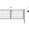 Accessoire-aanwijzing: De levering bevat een buisframeslot PZ-perforatie, DIN links en rechts te gebruiken, ophanging M16, deurkruk van aluminium, profielcilinder, aanslag, vloerschuif, oploopsteun, staander en bevestigingsbanden voor dubbele stang mesh matten.