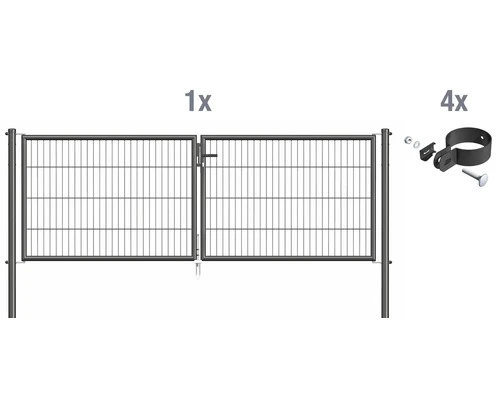 | Meegeleverd worden | – 1 x enkelstaafmat dubbele poort, antr., Ø42 mm, 2988 x 1000 mm, paal Ø60 mm- 4 x eindklem, antr., voor paal Ø60 mm, montagemateriaal, insteekslot |