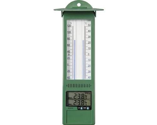Digitale min-max buitenthermometer gemaakt van kunststof, te bevestigen aan de muur. De gebruikte vloeistof is op basis van alcohol. Weergave van de omgevingstemperatuur (zowel mechanisch als digitaal) met behoud van de minium- en maximumtemperatuur. Is eventueel ook te resetten zodat u de gegevens van elk seizoen weer opnieuw kunt meten. Let op waar u de thermometer ophangt; vol in de zon of schaduw kan de gegevens vervalsen.